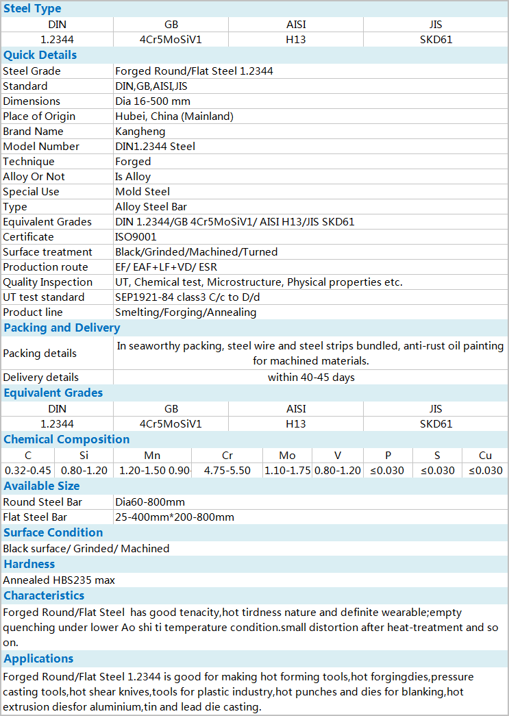 GB 4Cr5MoSiV1/AISI H13/DIN 1.2344/JIS SKD61
