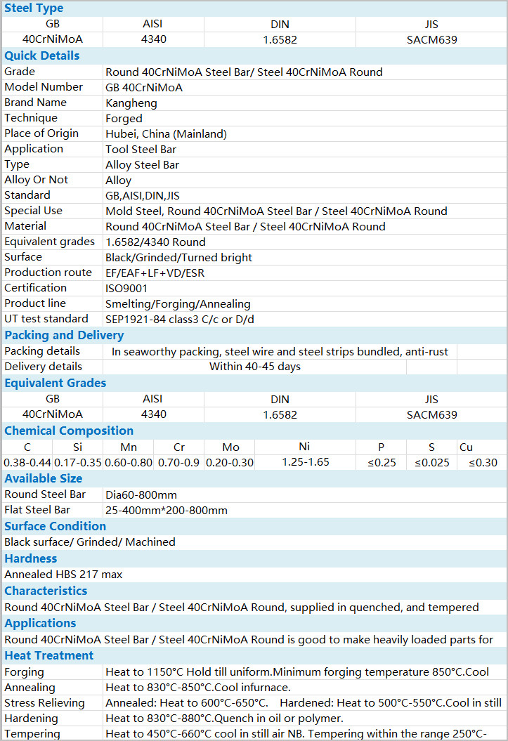 GB 40CrNiMoA/AISI 4340/DIN 1.6582/JIS SACM639