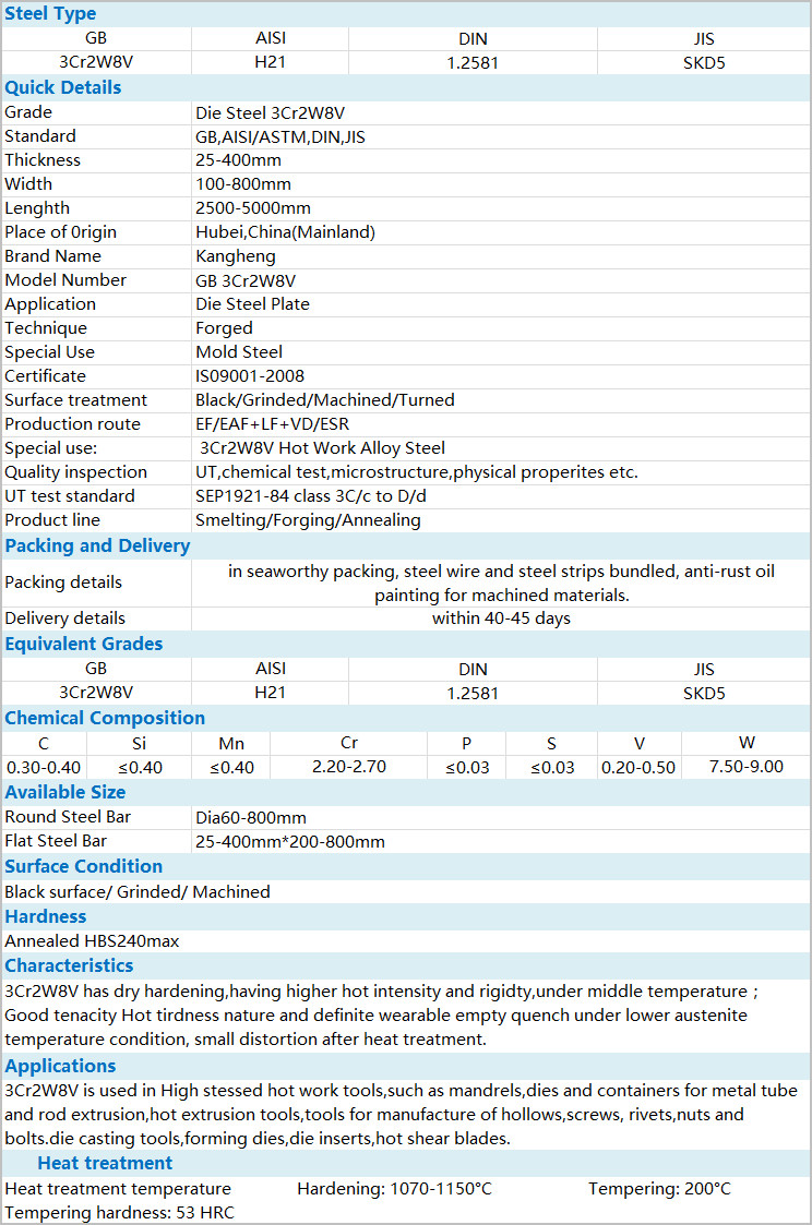 GB 3Cr2W8V/AISI H21/DIN 1.2581/JIS SKD5