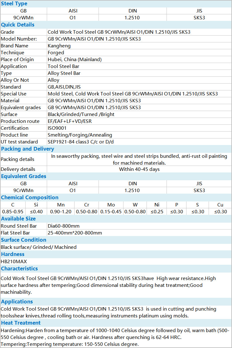 GB 9CrWMn/AISI O1/DIN 1.2510/JIS SKS3