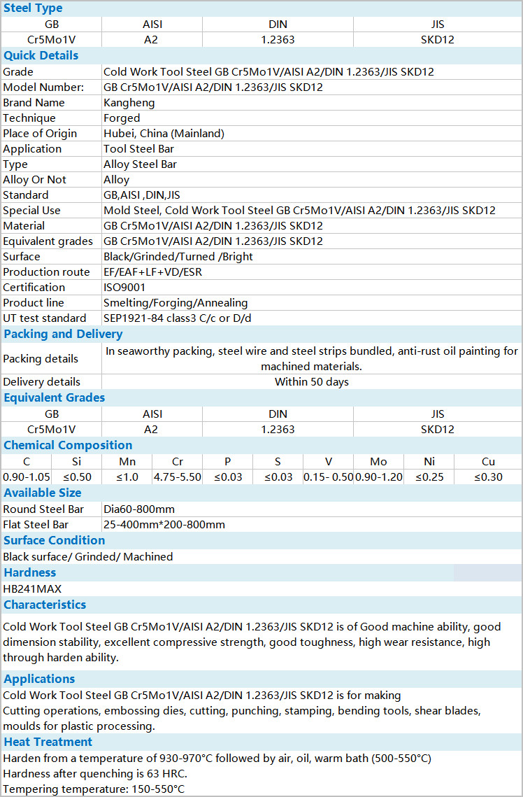 GB Cr5Mo1V/AISI A2/DIN 1.2363/JIS SKD12