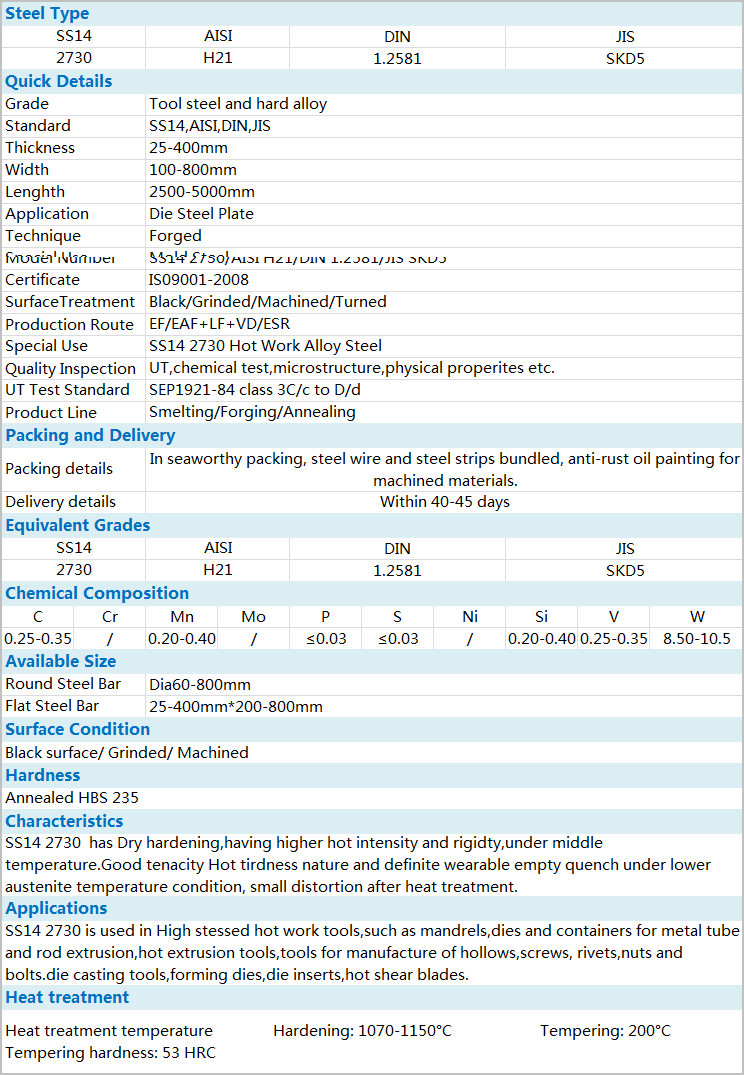 GB 3Cr2W8V/AISI H21/DIN 1.2581/JIS SKD5